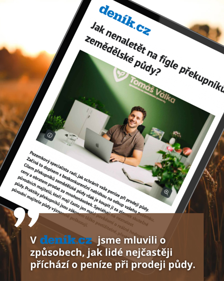 Mrzí mě, když lidé prodávají spekulantům z dopisů či internetu svůj cenný majetek – ornou půdu za zlomek její skutečné ceny. Poznal jsem spoustu vlastníků, kteří zjistili pravou hodnotu orné půdy, až když ji nenávratně prodali. Nemusí to tak být, pokud se před jakýmkoli prodejem poradíte s odborníkem, který půdě opravdu rozumí.